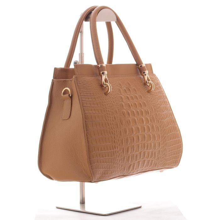 Сумка женская, закрывается на молнию. Материал-натуральная кожа с тиснением под крокодила. Внутри 2 отдела, разделенные перегородкой на молнии, в одном отделе карман на молнии, в другом карман для сотового телефона и портмоне. Снаружи на задней стенке есть карман на молнии. Модель имеет 2 ручки высотой 14 см и длинный ремень.