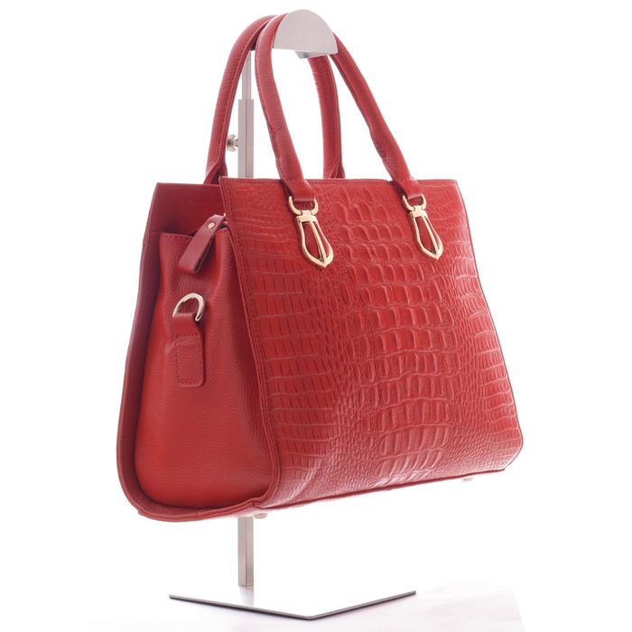 Сумка женская. Материал-натуральная кожа с тиснением под крокодила. Внутри 2 отдела, разделенные перегородкой на молнии, в одном отделе карман на молнии, в другом карман для сотового телефона и портмоне. Снаружи на задней стенке карман на молнии. Модель имеет две ручки высотой 14 см и длинный ремень.
