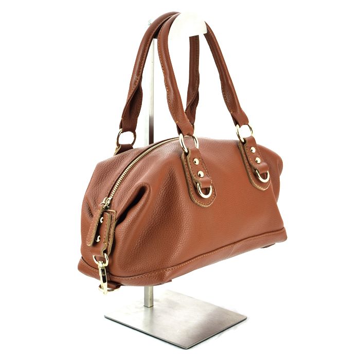 Сумка женская из натуральной кожи, закрывается на молнию. Внутри одно отделение, в котором карман на молнии и карман для сотового телефона и портмоне. Модель имеет 2 ручки высотой 16 см и длинный ремень.